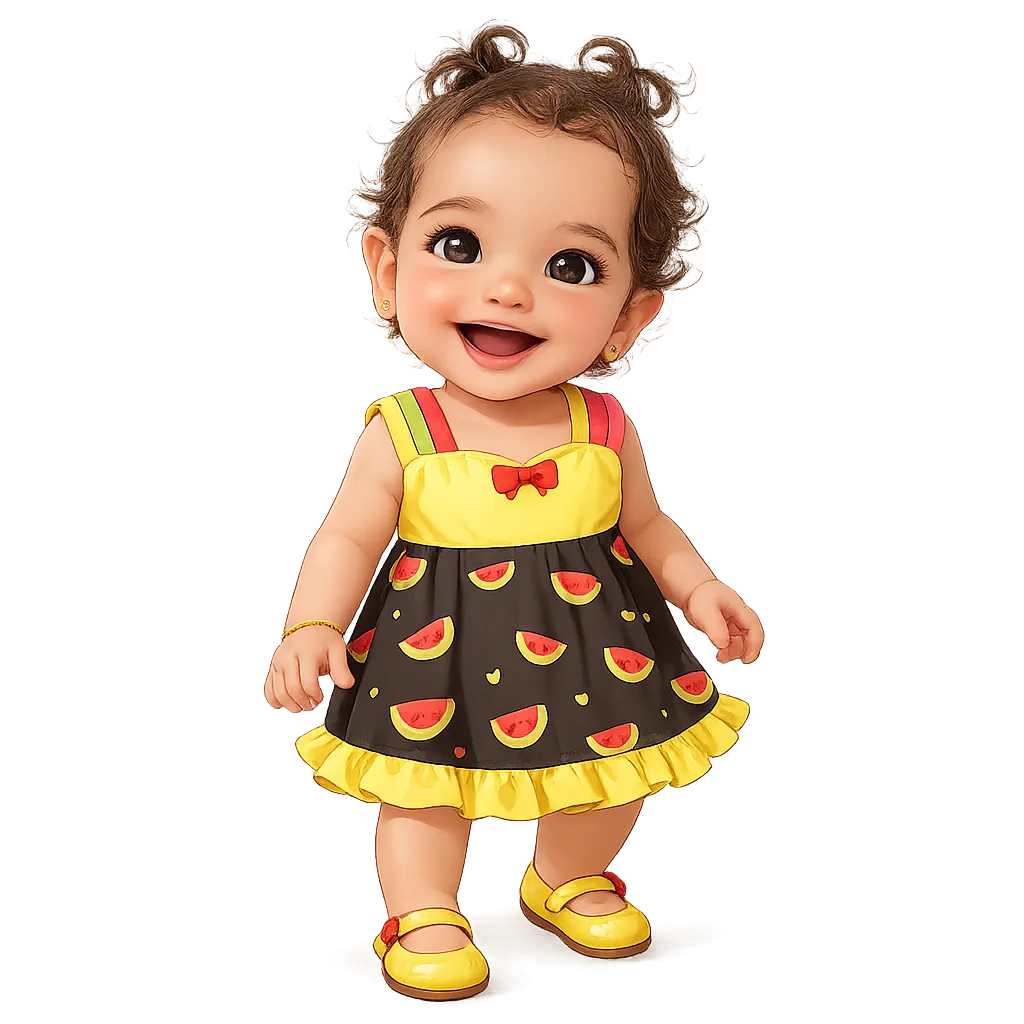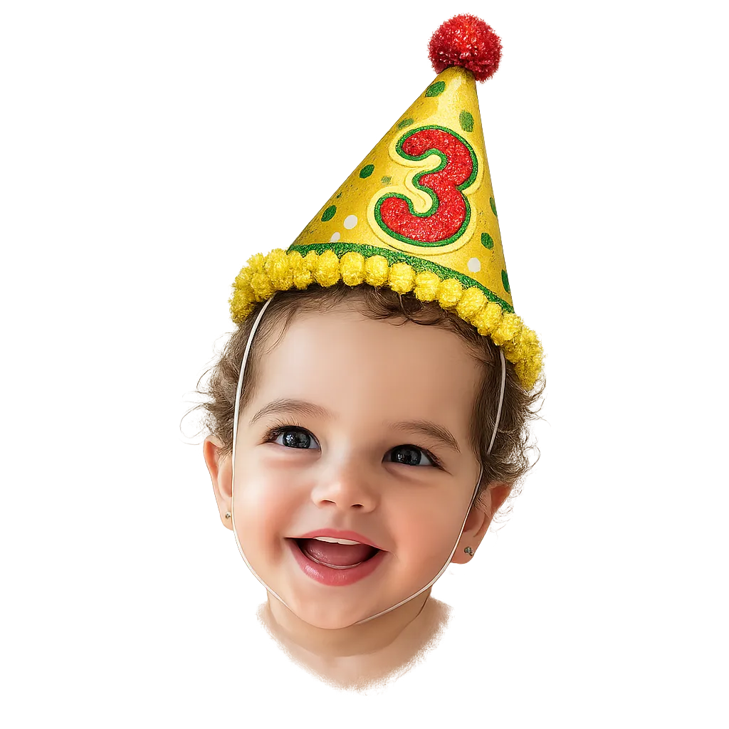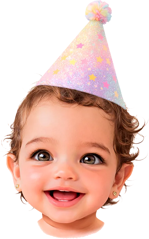 Gera o rostinho da criança como mascote fofo com chapéu de festa, ideal para convites, tags e rótulos.